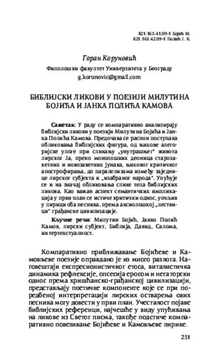Коруновић, Горан. “Библијски Ликови У Поезији Милутина Бојића И Јанка Полића Камова”. Edited by Јован Делић and Светлана Шеатовић. Поезија Милутина Бојића: Зборник Радова, 2017, 251-267.
