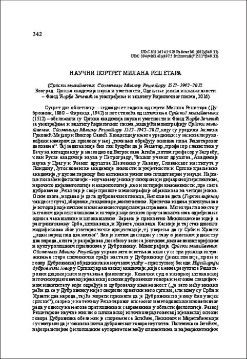Петаковић, Славко В. “Научни Портрет Милана Решетара: (Српски Молитвеник. Споменица Милану Решетару 1512–1942–2012. Београд: Српска Академија Наука И Уметности, Одељење Језика И Књиж”. Edited by Јован Делић. Зборник Матице Српске За Књижевност И Језик 66, no. 1 (2018): 342-347.