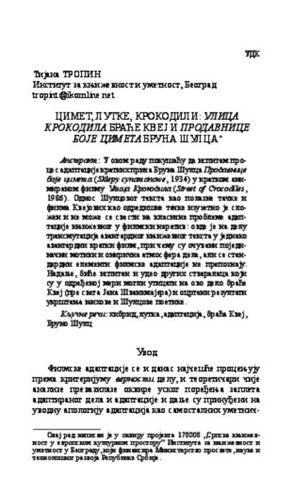 Тропин, Тијана. „Цимет, Лутке, Крокодили: "улица Крокодила" Браће Квеј И "продавнице Боје Цимета" Бруна Шулца: "улица Крокодила" Браће Квеј И "продавнице Боје Цимета" Бруна Шулца“. Преплитања И Укрштања : (Хибридност У Књижевности) : Зборник Радова, 2016., 303-322.