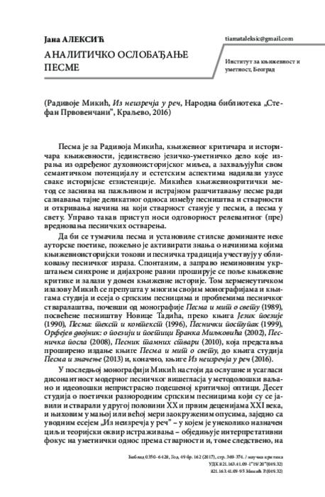 Алексић, Јана. „Аналитичко Ослобађање Песме: (Радивоје Микић, Из Неизречја У Реч, Народна Библиотека „Сте- Фан Првовенчани”, Краљево, 2016)“. Књижевна Историја: Часопис За Науку О Књижевности 49, изд. 162 (2017.): 369-374. http://knjizevnaistorija.rs/editions/162/aleksic.pdf.