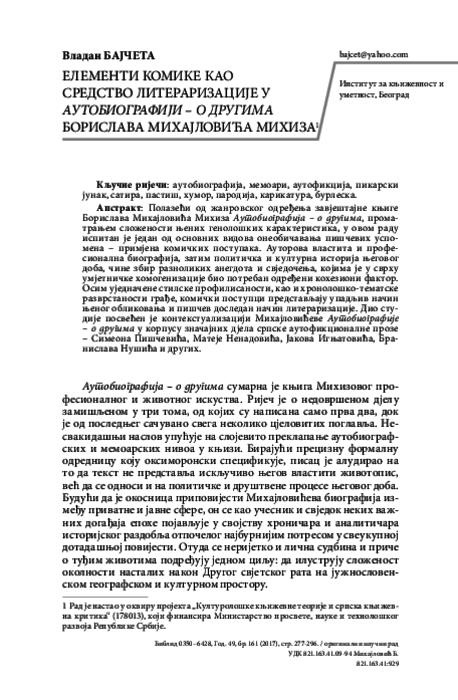 Бајчета, Владан. „Елементи Комике Као Средство Литераризације У Аутобиографији - О Другима Борислава Михајловића Михиза“. Књижевна Историја: Часопис За Науку О Књижевности 49, изд. 161 (2017.): 277-296. http://knjizevnaistorija.rs/editions/161/bajceta_v.pdf.