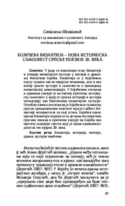 Шеатовић, Светлана. „Бојићева Византија - Нова Историјска Самосвест Српске Поезије 20. Века“. Уредио Јован Делић и Светлана Шеатовић, 2017., 87-105.