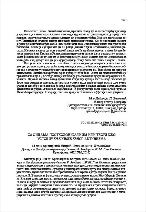 Алексић, Јана М. „Са Силама Постколонијалним Или Теоријско Устоличење Књижевног Активизма: (Јелена Арсенијевић Митрић. Terra Amata Vs. Terra Nullius: Дискурс О (Пост)Колонијализму У Делима Б. Вонгара И Ж. М. Г. Ле Клези“. Уредио Јован Делић. Зборник Матице Српске За Књижевност И Уметност 65, изд. 2 (no date): 743-747.