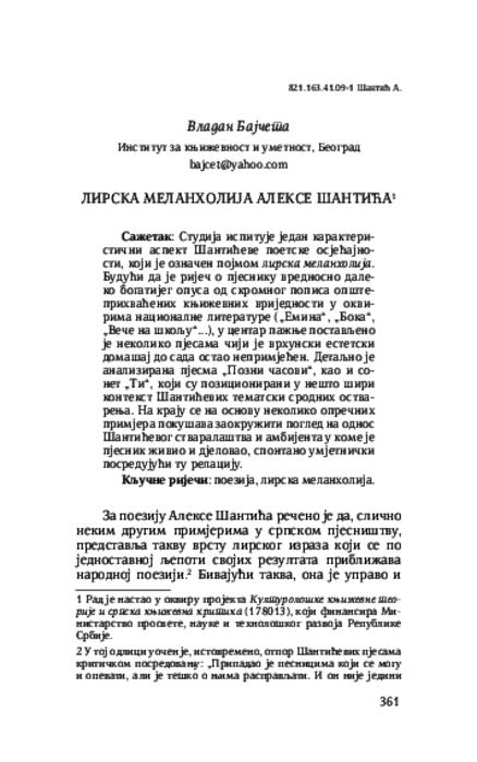 Бајчета, Владан. „Лирска Меланхолија Алексе Шантића“, 2017., 361-374.