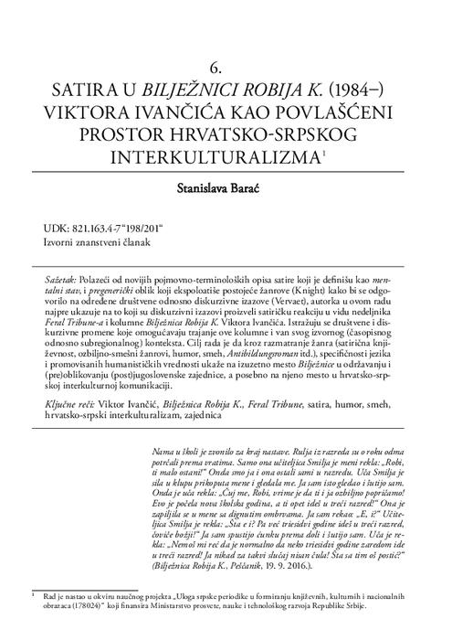 Barać, Stanislava. „Satira U Bilježnici Robija K. (1984-) Viktora Ivančiča Kao Povlašćeni Prostor Hrvatsko-Srpskog Interkulturalizma“. Hrvatsko-Srpski/srpsko-Hrvatski Interkulturalizam Danas : Zbornik Radova S Međunarodnoga Znanstvenog Skupa Desničini Susreti 2016, 2017., 99-116.