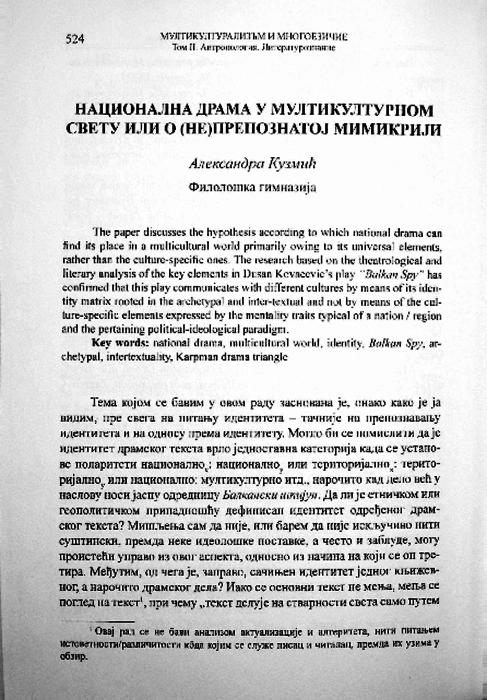 Кузмић, Алексаидра. „Национална Драма У Мултикултурном Свету Или О (Не)Препознатој Мимикрији“. Мултикултурализђм И Многоезичие: Сборник С Доклади От Тринадесетите Международни Славистични Четенил - Софил, 21-23 Април 2016 Г. Том Ii. Антропологил. Литературознание, 2017., 524-532.