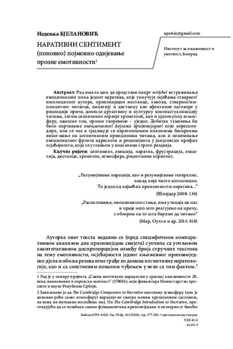 Бјелановић, Недељкa В. „Наративни Сентимент: (Поновно) Појмовно Одијевање Прозне Емотивности“. Књижевна Историја: Часопис За Науку О Књижевности 50, изд. 164 (2018.): 177-204. http://knjizevnaistorija.rs/editions/164/bjelanovic.pdf.